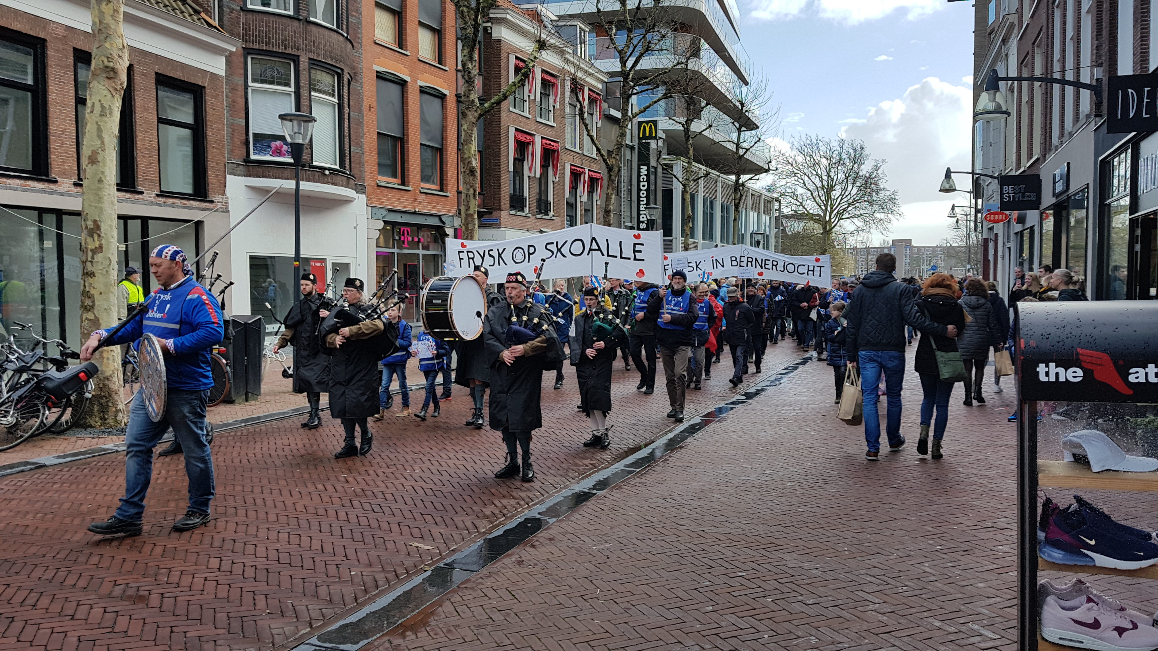 De organisaasjes hie it waar tsjin. De depresje wie der earder as ferwachte en dat betsjutte reinwetter, hurde wyn en kjeld. Likegoed sammelen har mear as hûndert minsken by it Frysk Museum om mei te dwaan oan de demonstrative kuiertocht troch de stêd. De manifestaasje sette de middeis om trije oere útein mei in koarte taspraak fan Piter Dykstra fan 'Sis Tsiis'. Hy rôp jong en âld op om man- froumachtich efter sterke man Wout Zijlstra as in soarte fan Grutte Pier begelaat troch de muzyk fan de Cape Breton Highlanders (doedelsekspilers) oan te rinnen en sa in omgong troch de stêd te meitsjen. It waard in hiele optocht mei flachjes, toeters en grutte omheech holden spandoeken, dy't oer Wurdumerdyk, 'stille kant' Nijstêd en lâns de oare kant werom nei it Saailân gie. Underweis waarden mei nocht en wille flyers útdield. De optocht krige in protte omtinken fan it winkeljend publyk. Dat late tagelyk ta tal fan nijsgjirrige petearen. It moat sein wurde, op dat stuit wierre it waar mei.