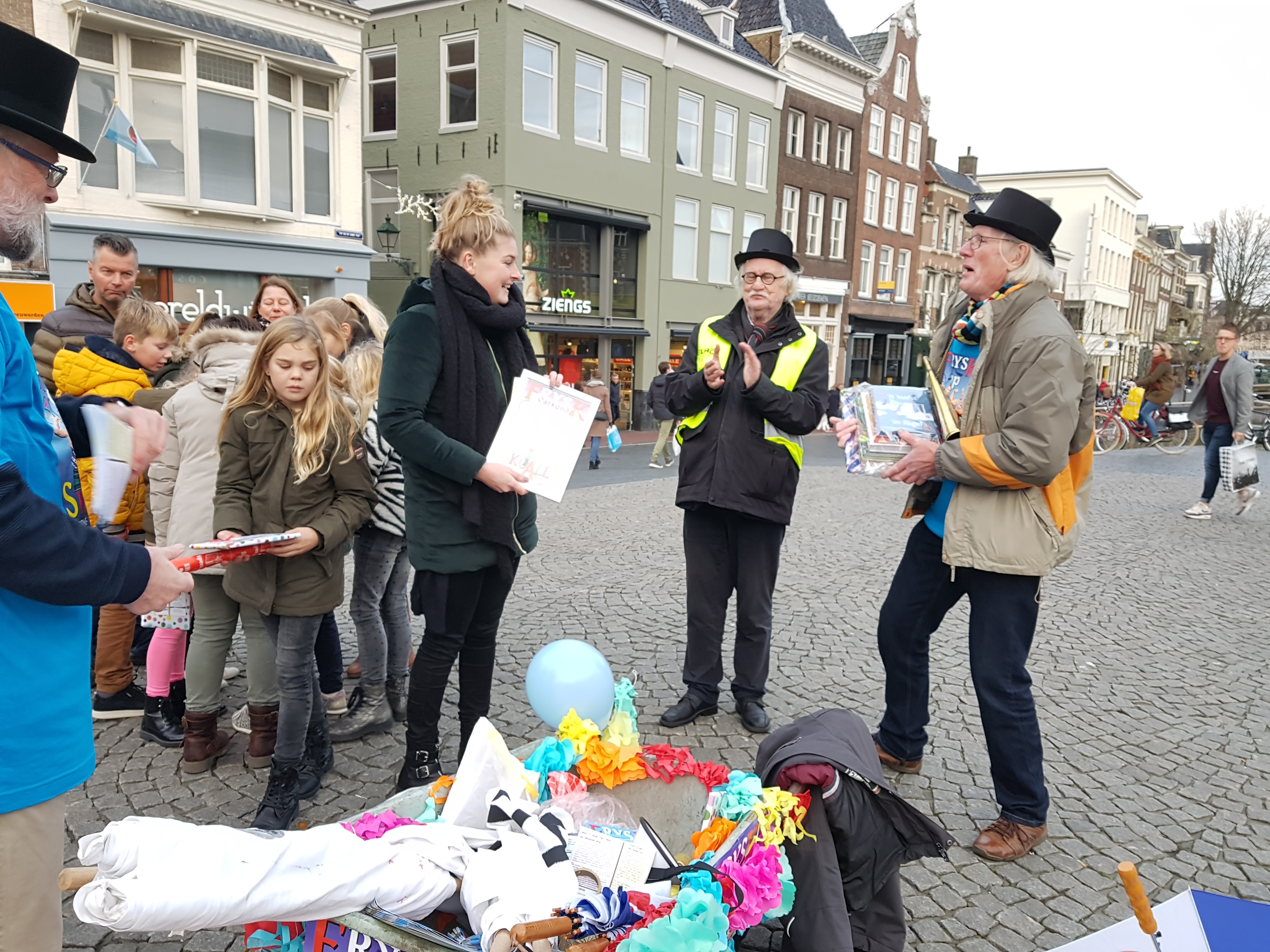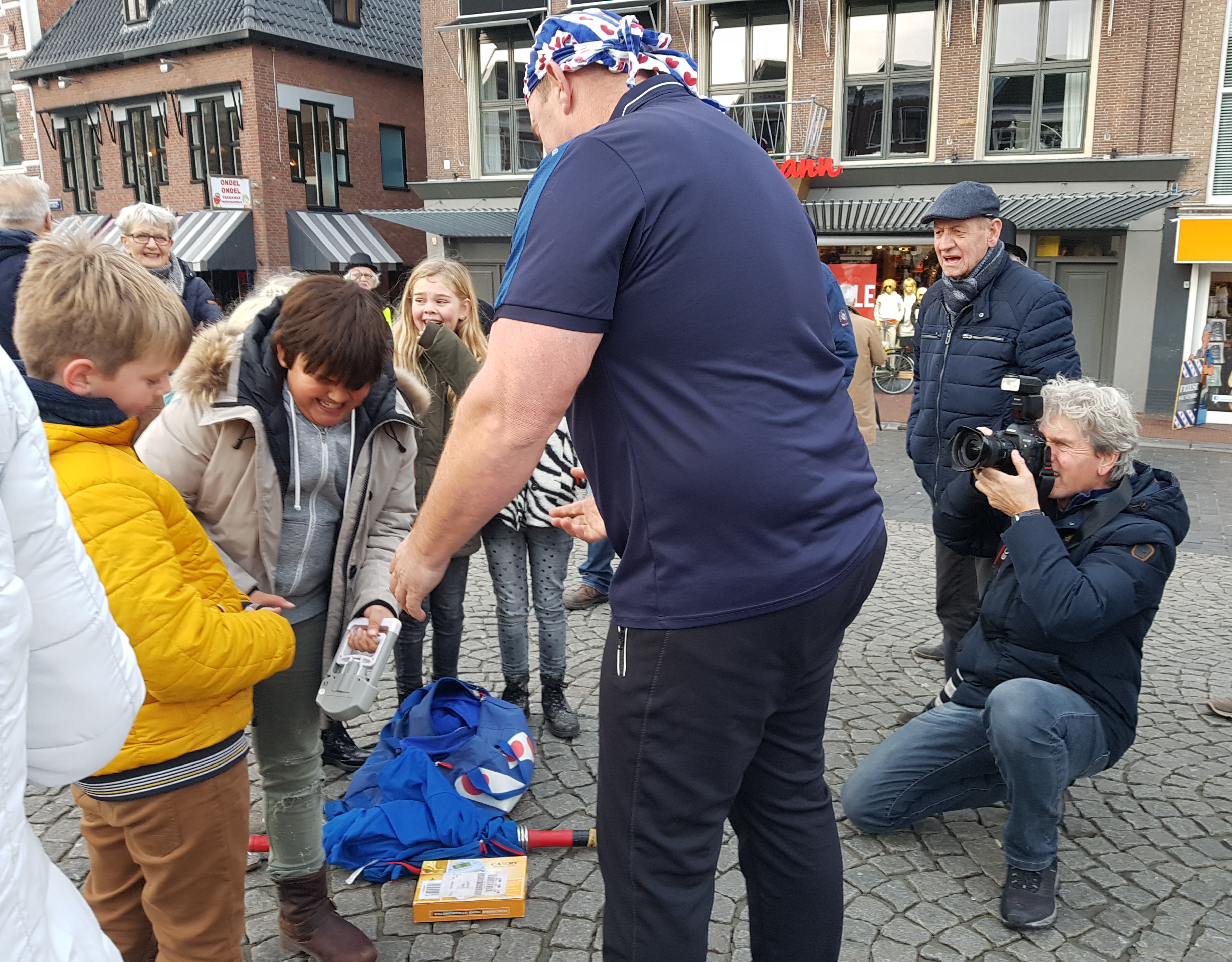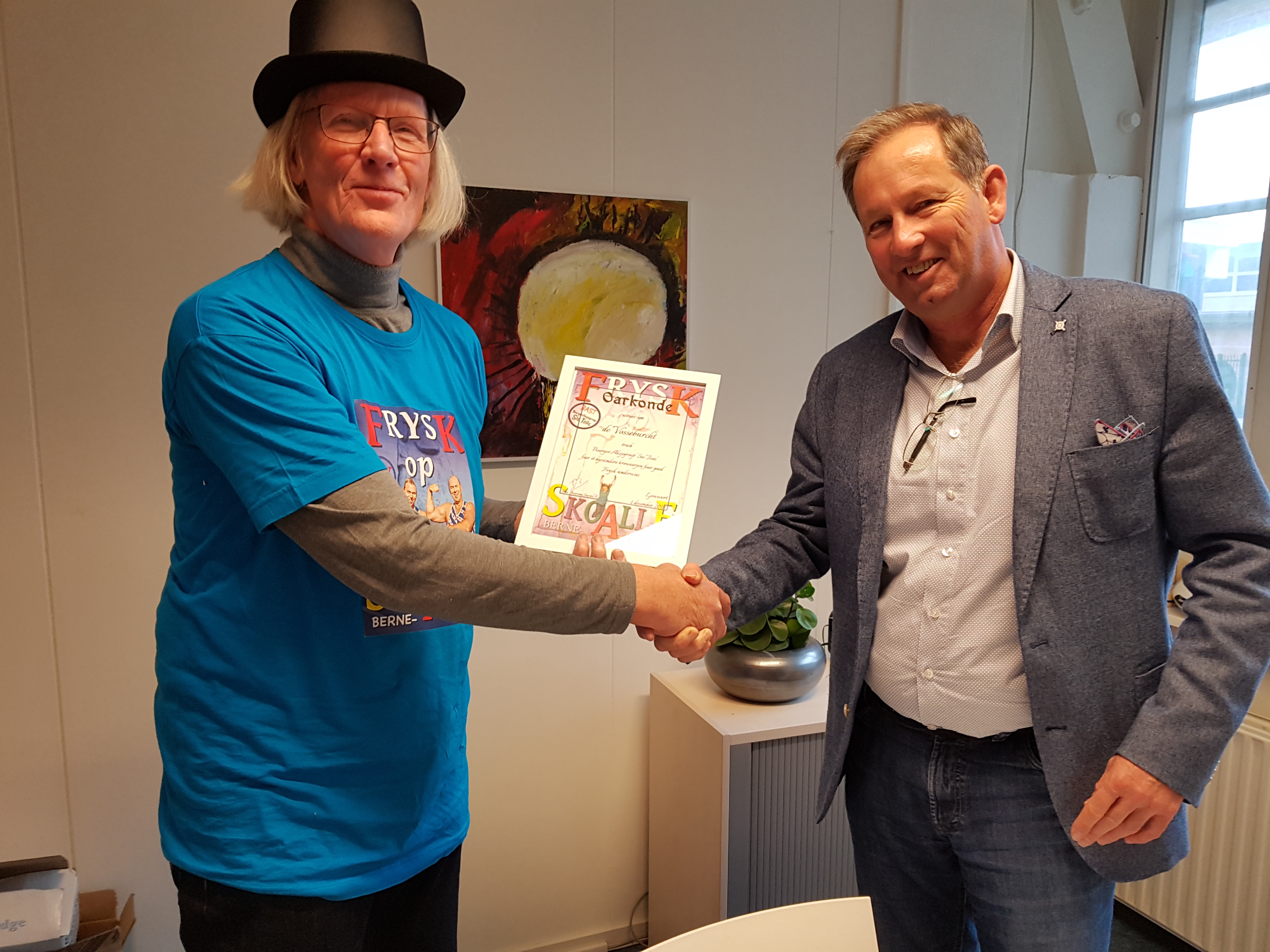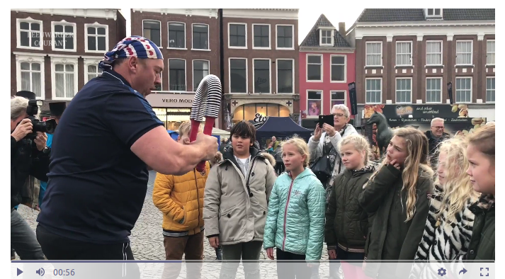 Drie Leeuwarder basisscholen hebben de ondergrens voor Friese les op school verlaten. Reden voor burgeractiegroep Sis Tsiis om ze te belonen.,,Mei ien hân knipe, hé? Der wurdt net smokkele”, zegt sterke man Wout Zijlstra op de lange pijp in het centrum van Leeuwarden. Sofie (9) knijpt 20,9 kilo in de krachtmeter, niet slecht.